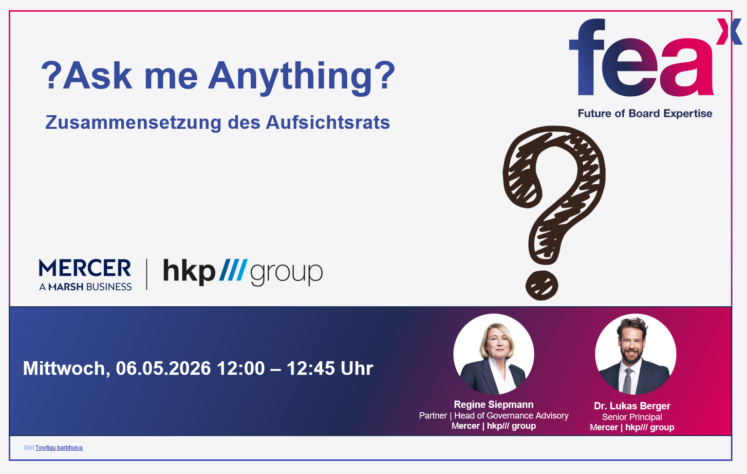 Diese und weitere Fragen erörtern die Mercer | hkp///group Corporate Governance Advisors Regine Siepmann und Dr. Lukas Berger in unserem nächsten Ausgabe eines ASK ME ANYTHING am 6. Mai 2026 von 12:00 bis 12:45 Uhr.