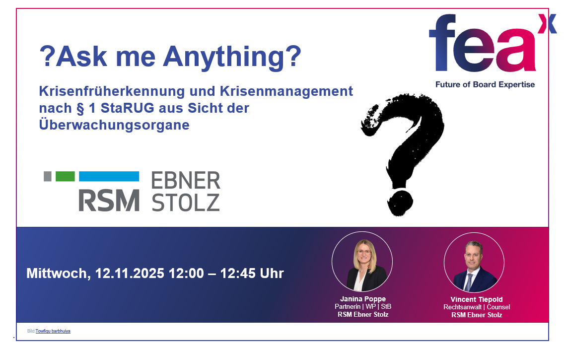 Für einen Überblick zu den Pflichten der Überwachungsorgane in einer möglichen Unternehmenskrise und Ausgestaltung eines Systems zur Krisenfrüherkennung und zum Krisenmanagement laden wir Sie herzlich zu unserer Ask-me-Anything-Ausgabe am Mittwoch, den 12. November 2025 von 12:00-12:45 Uhr, ein.