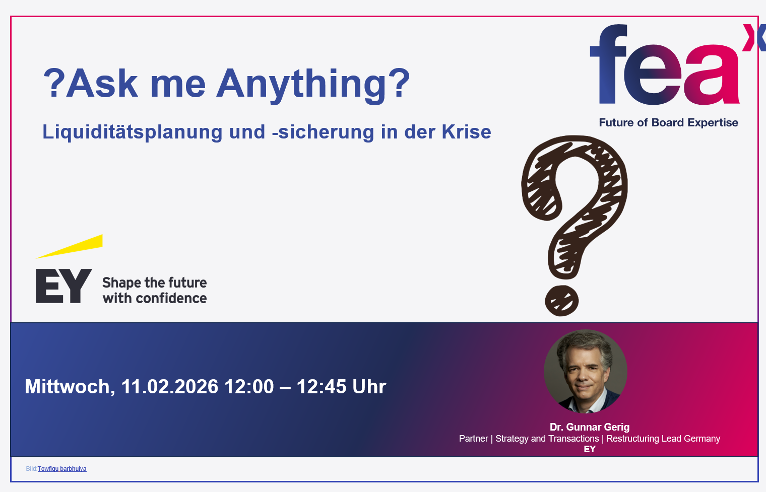 Ein immer anspruchsvolleres Markt- und Finanzierungsumfeld stellt viele Unternehmen vor die Notwendigkeit, ihre Liquiditätsentwicklung intensiv zu beobachten. Worauf bei der Liquiditätsplanung und -sicherung in der Krise zu achten ist, beleuchten wir in unserer kommenden Ask-me-Anything-Ausgabe.