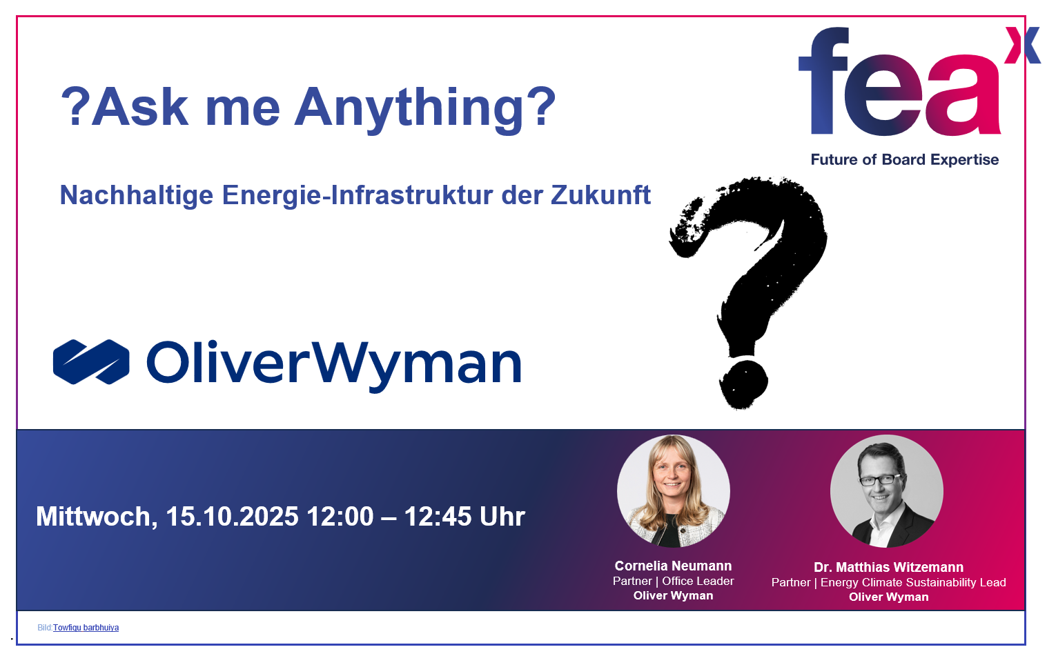 Als Referenten begrüßen wir Dr. Matthias Witzemann, Partner und Lead Klima und Nachhaltigkeit Deutschland und Österreich, sowie Cornelia Neumann, Partnerin im Risikomanagement bei Oliver Wyman. Moderiert wird das Webinar von fea-Vorstand Ulrich Beck.