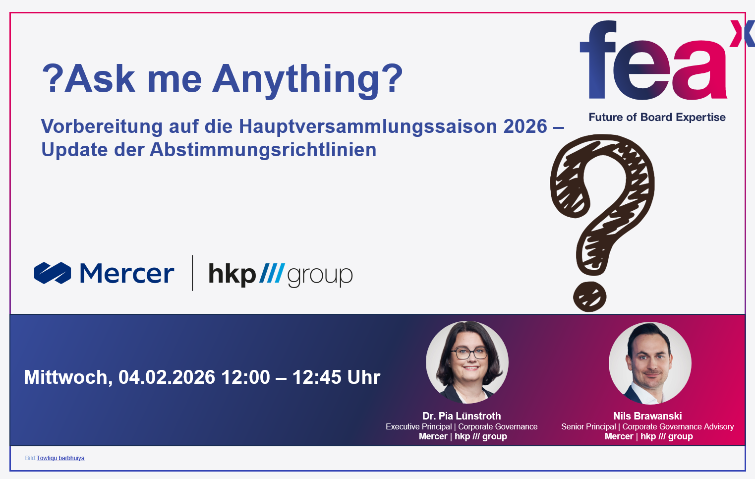 Diese und weitere Fragen erörtern die Mercer | hkp///group Corporate Governance Advisors Dr. Pia Lünstroth und Nils Brawanski in unserem nächsten ASK ME ANYTHING am 4. Februar 2026 von 12:00 bis 12:45 Uhr.