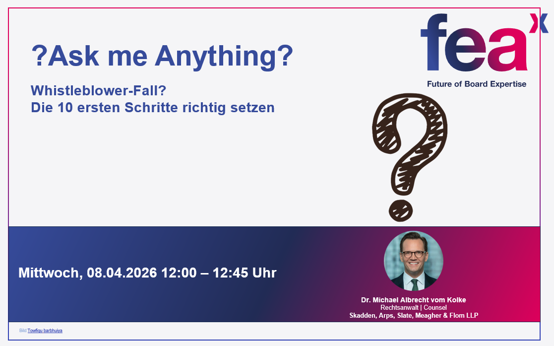 In diesem Ask me Anything am Mittwoch, 08. April 2026, von 12:00 bis 12:45 Uhr stellt Dr. Michael A. vom Kolke aus dem Frankfurter Büro von Skadden, Arps, Slate, Meagher & Flom die ersten Schritte für Aufsichtsratsmitglieder in Compliance-Fällen vor. Er berät Aufsichtsräte seit vielen Jahren im Zusammenhang mit Sondersituationen und der Aufklärung von Compliance-Fällen – von Cum/Ex-Geschäften über die Panama Papers bis zur Diesel-Abgasthematik und vielem mehr. Die Teilnehmer sollen in die Lage versetzt werden, gerade in der heiklen Anfangsphase kostspielige Fehler zu vermeiden und durch die richtigen Weichenstellungen die Handlungshoheit zu behalten.