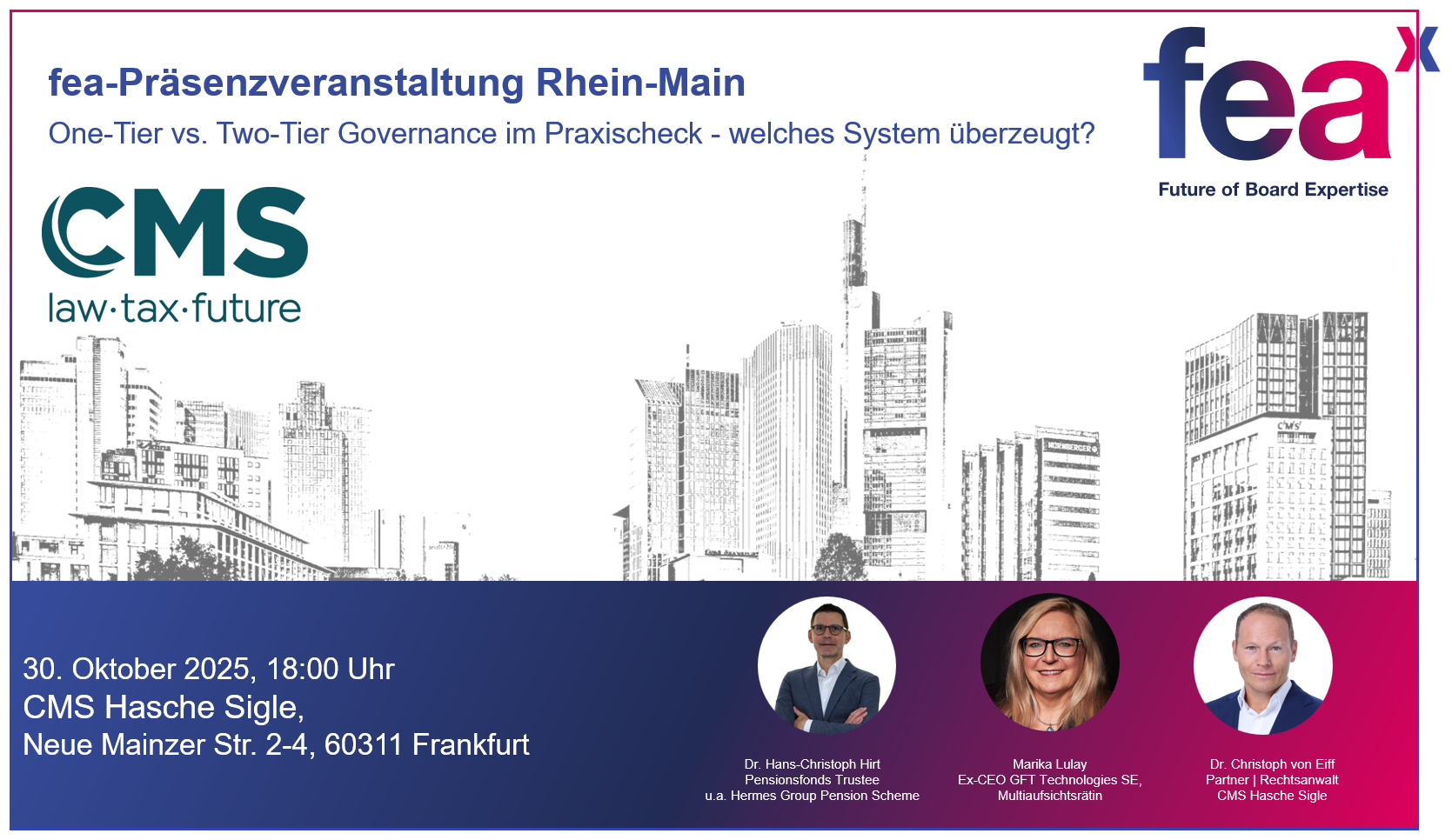 Diskutieren Sie diese und weitere Fragen persönlich mit führenden Köpfen und Praktikern der Unternehmensführung beim exklusiven fea-Panel, unterstützt von unserem Fördermitglied CMS.
