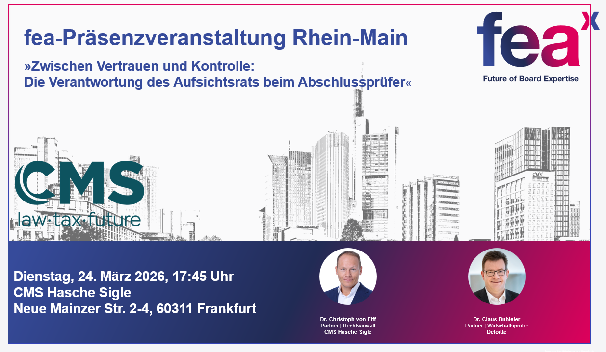 Ein herzlicher Dank geht an unser Fördermitglied CMS Hasche Sigle, vertreten durch Dr. Christoph von Eiff, für die Bereitstellung der Räumlichkeiten und des Caterings.
