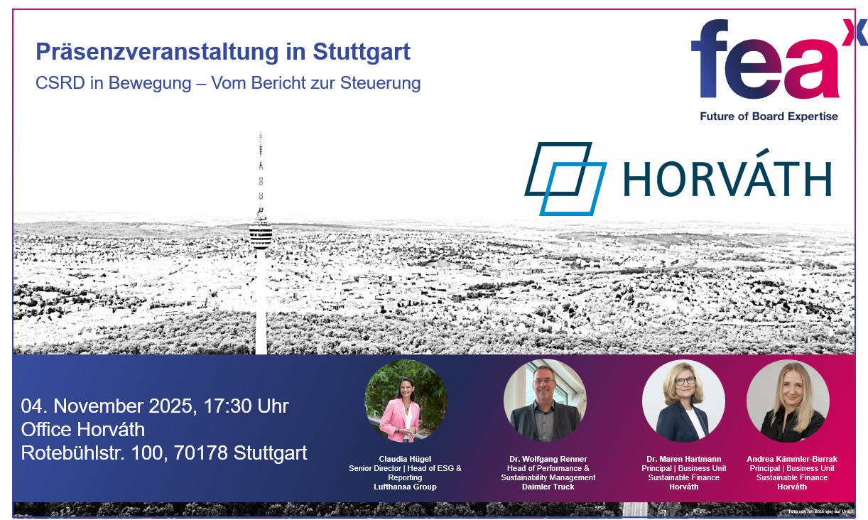 Wir laden Sie herzlich ein zu einer exklusiven Veranstaltung, am Dienstag, 04. November 2025 um 17:30 Uhr, Horváth-Office Stuttgart, die Ihnen Praxis-Einblicke und -Erfahrungen aus der ersten CSRD-Berichtsperiode sowie Impulse und strategische Perspektiven für Aufsichtsräte und Entscheider bietet.