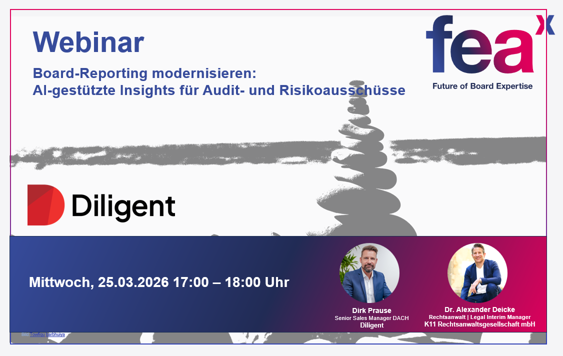 Wenn Audit- und Risikoausschüsse noch mit statischen PDF-Paketen und Excel-Listen arbeiten, kommen entscheidungsrelevante Risiken oft zu spät auf den Tisch. Im kommenden Webinar mit unserem Förderer Diligent zeigen Dr. Alexander Deicke (KI-Experte & Legal Counsel) und Dirk Prause (Sales Director DACH, Diligent), wie Aufsichtsräte und C‑Level KI nutzen können, um komplexe Finanz‑, Risiko- und Compliance-Daten in klare, prüfungsreife Entscheidungsgrundlagen zu übersetzen – transparent, nachvollziehbar und regulatorisch belastbar. Ziel ist nicht mehr Reporting-Volumen, sondern präzisere Insights für den Prüfungsausschuss, die den Fokus dorthin lenken, wo es für Unternehmenswert und Governance wirklich kritisch wird.
