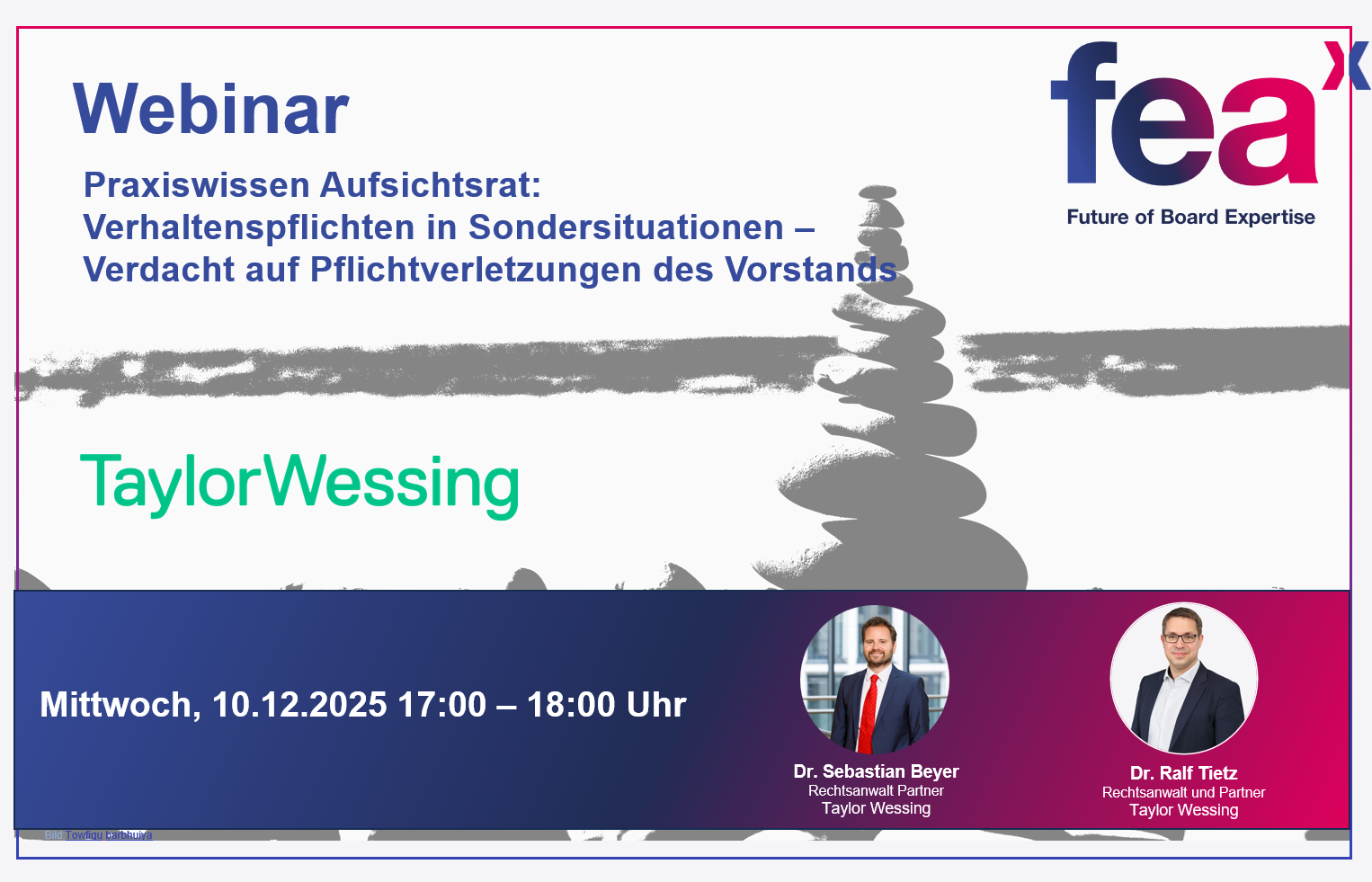 Was dies für Sie als Aufsichtsräte und Finanzexperten im Einzelfall bedeutet, werden Dr. Ralf Tietz und Dr. Sebastian Beyer beide Rechtsanwalt und Partner bei Taylor Wessing und ausgewiesene Experten im Aktien- und Kapitalmarktrecht, in einem Webinar am Mittwoch, den 10.12.2025, von 17:00 – 18:00 Uhr gemeinsam mit Ihnen erörtern, um Ihnen Impulse für die Tätigkeit in Ihren Gremien und Handlungsempfehlungen zu geben.